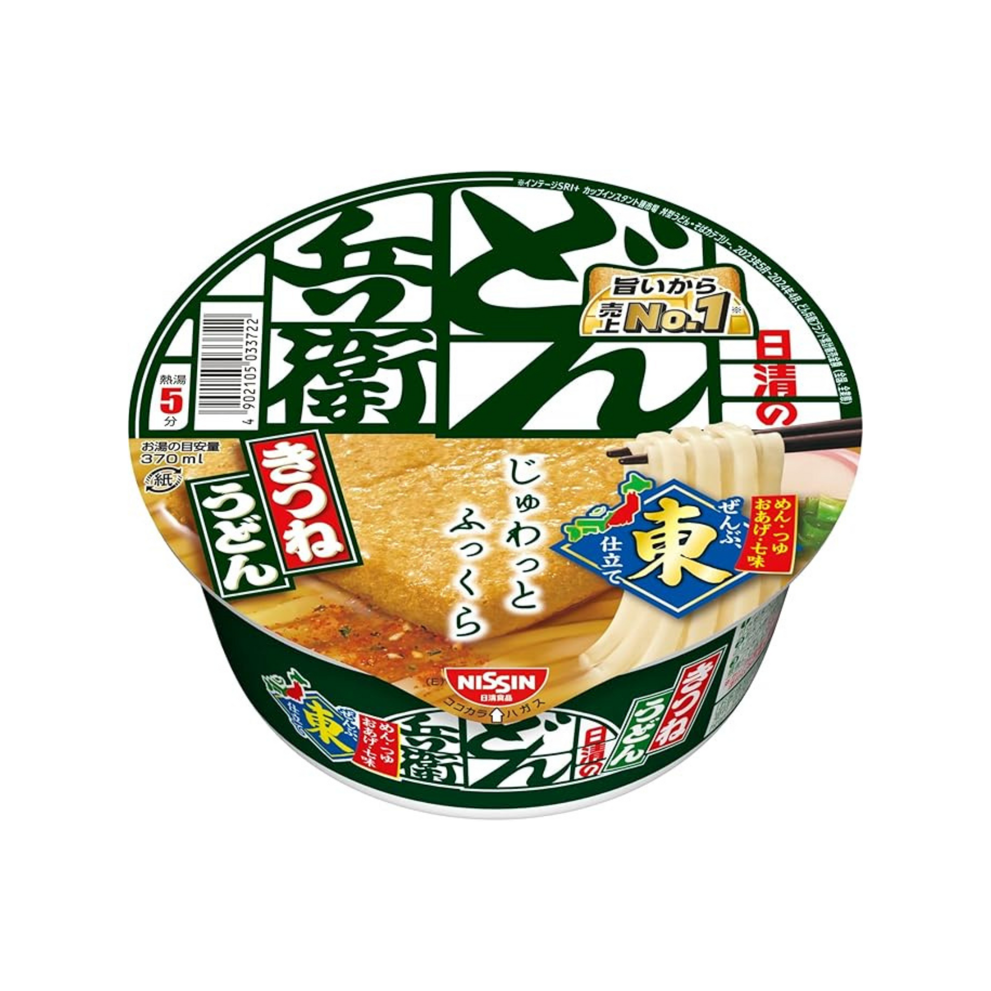 日清のどん兵衛 きつねうどん(東日本版)は、もちもちのうどんに、かつお節と宗田節の二種類のだしを効かせた濃口しょうゆ仕立てのつゆが特徴です。豆腐屋製法で大豆を丸ごと使ったふっくらおあげがのっており、東日本風の七味唐辛子で味を引き締めます。